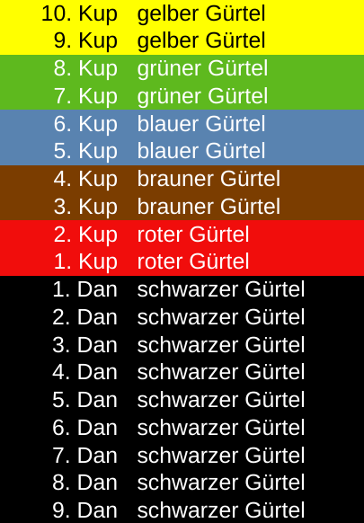 Es werden bei uns immer zwei Kups zu einer Farbe zusammengefasst, nicht zuletzt deswegen, weil man so nicht nach jeder Prüfung einen neuen Gürtel braucht. Der 6. und 5. Kup sind beispielsweise beides blaue Gürtel. (Eigentlich wären das ein blauer Gürtel, und ein blauer Gürtel mit braunem Streifen)